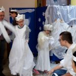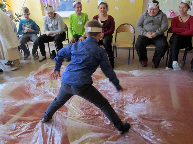 W zimowej scenerii- migoczących światełek , gwiazdek, śnieżynek, sopli lodu dzieci brały udział w zabawach integracyjnych, uczyły się piosenki „ Biały walczyk”,