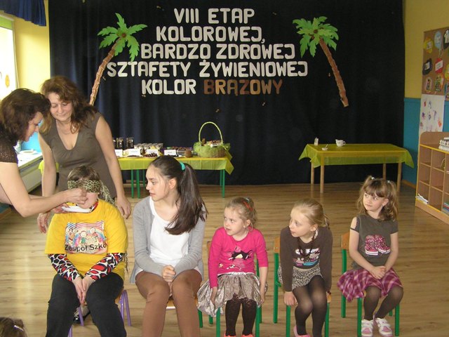 VIII etap „Sztafety” odbył się 16 kwietnia 2015r. w Publicznym Przedszkolu Nr 4 w Zduńskiej Woli. Kolorem obowiązującym na tym spotkaniu był kolor brązowy. Królowały wtedy kakao, kokosy, orzechy, migdały, daktyle, miód gryczany, powidła śliwkowe i oczywiście czekolada. Dzieci i młodzież prezentowały informacje o właściwościach brązowych produktów.