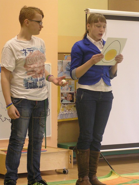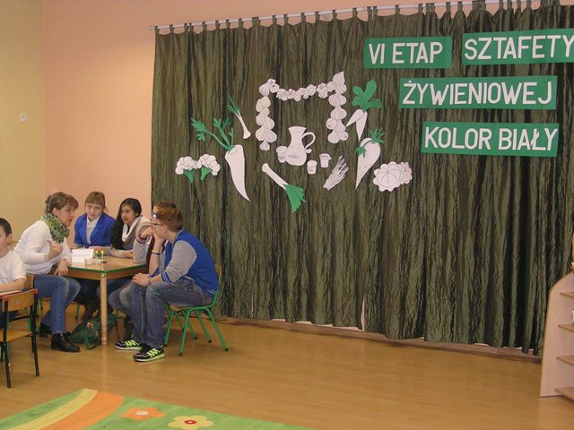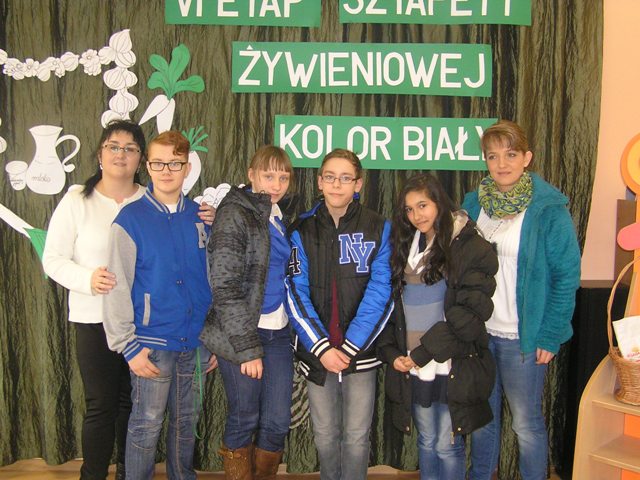 VI etap „Sztafety” odbył się 23 lutego 2015r. w Publicznym Przedszkolu nr 7 „Pod Zielonym Semaforem” w Zduńskiej Woli. Kolorem obowiązującym na tym spotkaniu był kolor biały. Królowały wtedy nabiał, czosnek i biała rzodkiew. Dzieci i młodzież prezentowały informacje o właściwościach białych warzyw i różnych produktów spożywczych. Z pomocą swoich nauczycieli i opiekunów przygotowały sałatki, twarożki, jogurty. Uczestnicy wzięli udział w konkursach i zabawach tematycznych. Nie zabrakło też zabaw ruchowych i konkurencji sportowych na potwierdzenie założenia, że aby żyć według zdrowego stylu życia należy zdrowo się odżywiać, ale też stosować aktywność fizyczną każdego dnia. Spotkanie wszystkim zebranym sprawiło wiele radości, przysporzyło wiedzy i nowych umiejętności. Zespół Szkół im. Marii Grzegorzewskiej reprezentowali uczniowie szkolnego Klubu Młodego Ekologa – klasy VIa, pod kierunkiem opiekunek Klubu i koordynatorek Projektu – Pani Marty Pałuszyńskiej i Pani Anety Piontek. Uczniowie przygotowali prezentację zdrowotnych właściwości białka jajka kurzego i zaproponowali sałatkę z jajkiem, jako posiłek zawierający dużą ilość tego składnika. „Pałeczką sztafety” przekazaną Gospodarzom przez uczniów było oczywiście jajko.